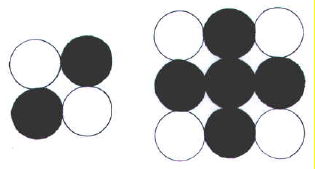 5p2........... iv) The rest of the electronic structure is also easily deduced from an understanding of the periodic table's layout: . vi) Chemical properties: Since so many chemical properties depend on the number of outer electrons and the number of inner shells, even these properties may be deduced (chapters 13 to 18). vii) Physical properties: These too depend on electron configuration. The relative atomic mass is also directly relevant to physical properties, but even this can be roughly estimated: viii) Relative atomic mass: This can be roughly estimated once the atomic number has been deduced. The basis of the estimation is as follows. Hydrogen has a sole proton in its only stable nucleus. From helium onwards, neutrons are needed in the nucleus to stabilise it, and after bismuth (atomic number 83) no number of neutrons will produce a stable nucleus. The ratio of neutrons:protons needed to stabilise a nucleus increases from 1:1 for helium, to about 1.5:1 for 83Bi. A simple model is consistent with this fact. Protons are positively charged and therefore repel each other. Neutrons can be regarded as keeping them apart. Thinking in only two dimensions, it can be seen that only two neutrons would be needed to keep two protons apart, whereas five would be needed to keep four protons apart (FIG. 2-7.jpg).